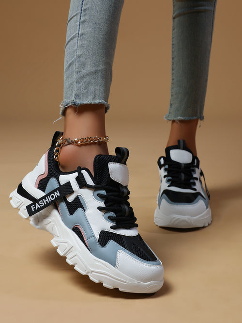 2025 New Women's Color-Block Chunky Dad Sneakers - Black White Pink Mesh Panel, Thick Sole, Retro Fashion Casual Athletic Shoes